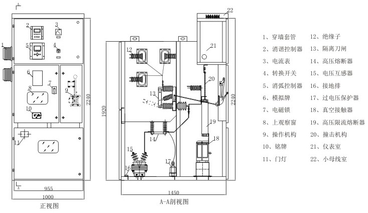 消弧柜为固定式开关柜,外形尺寸可根据用户要求加工,消弧柜结构如装罝结构图所示。对6kv、10kv的柜体,考虑用户检修方便,宽度般不小于800mm,对于35kv柜体,宽度般不小于1800mm,深度