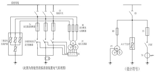 在我国3~35KV供电系统中,大部分为中性点不接地系统,这种系统在发生单相接地时,电网仍可带故障运行,这就大大降低了运行成本,提高了供电系统的可靠性,但这种供电方式在单相接地电流较大时容易产生弧光接地过电压和相间短路,给供电设备造成了很大的危害。以前的解决办法是在中性点加装消弧线圈补偿电容电流来抑制故障点弧光发生的机率。很显然,这种方法的目的是为了消除弧光,但由于消弧线圈的自身的诸多特点,很难对电容电流进行有效补偿,特别是高频分星部分对供电设备造成的危害无法克服。为此我公司研制生产了新型的消弧消谐及过电压保护装AYTBP,该装罝在出现弧光接地时,通过一组可以分相控制的真空接触器,使故障相接地,达到消除弧光的目的。